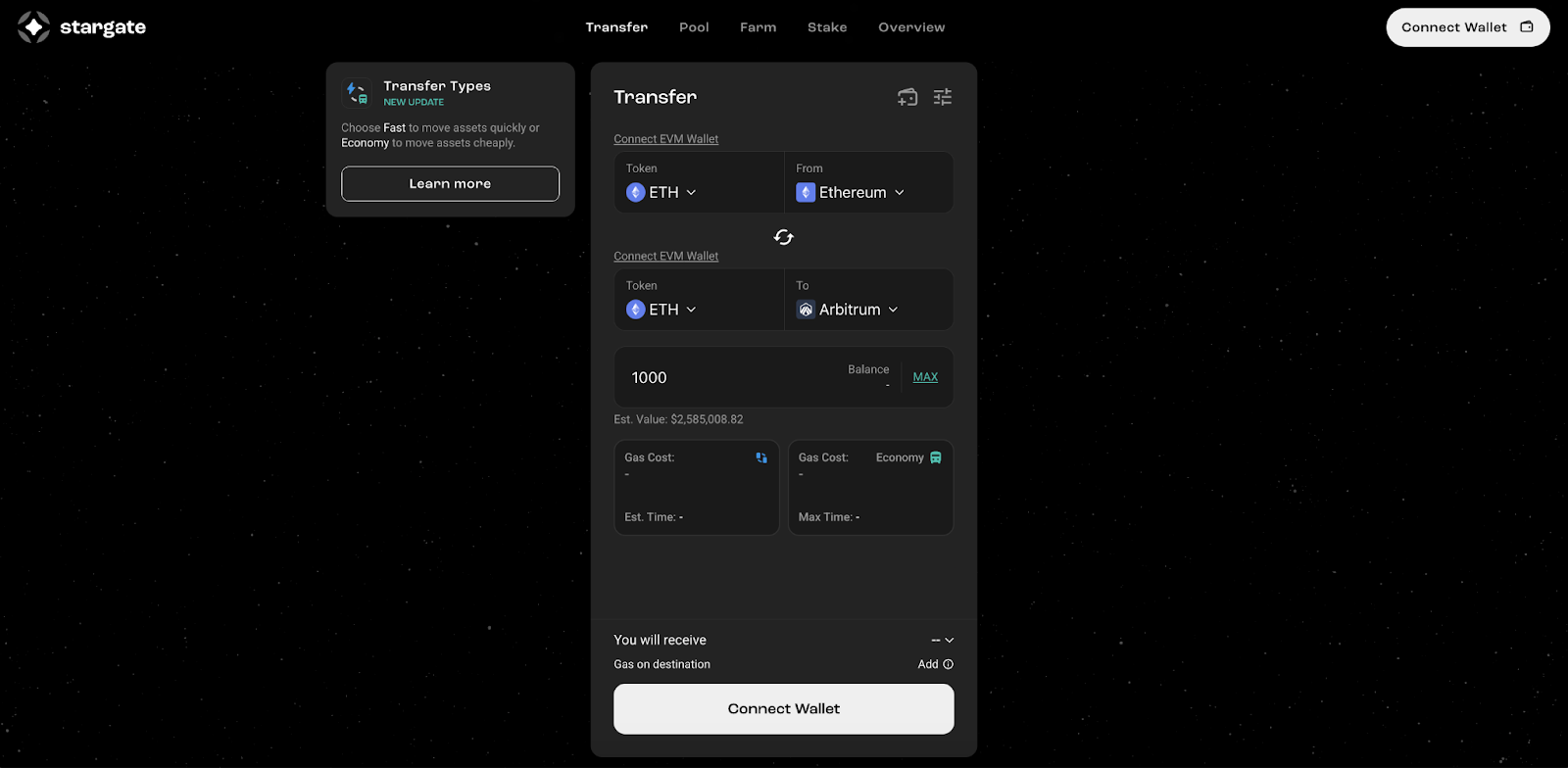 Website:stargate.financebr>Stargate supports Ethereum, Arbitrum, BNB Chain, Avalanche, Optimism, and more. It uses LayerZero technology to enable secure cross-chain transfers of native assets no wrapping needed. To bridge, simply connect your wallet, select the source and destination chains, choose your token, and approve the transaction.